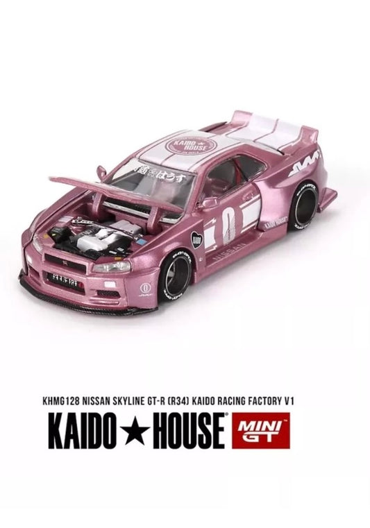Kaido House (x MiniGT) - Regular Release #128 - Pink Nissan Skyline GT-R (R34) Kaido Racing Factory V1