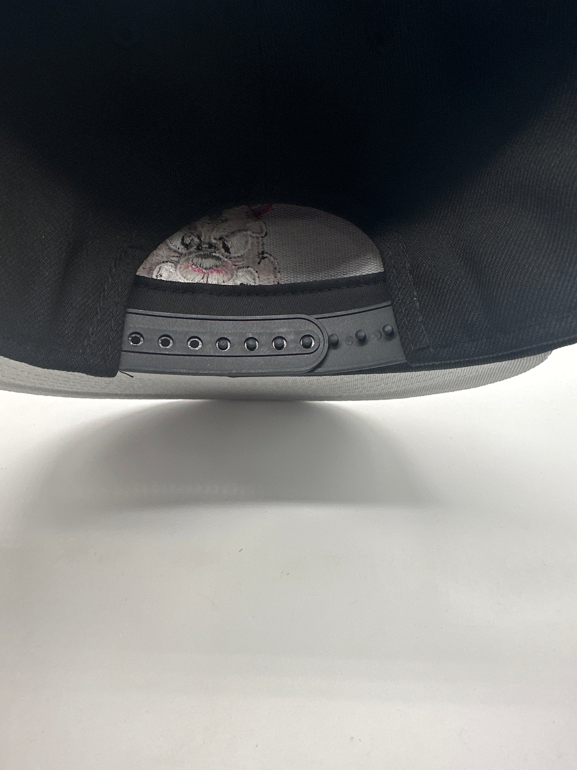 Black SnapBack adjustable hat (one size fits most) - with embroidered blue crash test gummy on the front and the NVRLand patch on the side. One of only 50 of this hat made!